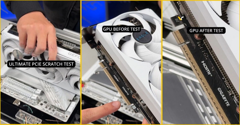 Японский офис компании Gigabyte опубликовал в соцсети X видео, в котором показано, что после сотни установок и извлечений карты из разъёма PCIe x16 на её материнских платах никаких повреждений на интерфейсе PCIe x16 самой карты не возникает.
