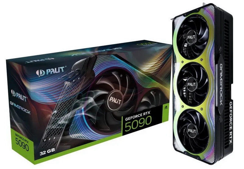 На сегодняшний день в российских магазинах представлены два варианта флагмана поколения Nvidia Blackwell — Palit GeForce RTX 5090 GameRock OC с заводским разгоном, у которой GPU работает на частоте 2527 МГц вместо 2407 МГц и «обычная» GeForce RTX 5090 GameRock без разгона — она чуть дешевле. Обе видеокарты получили красочную переднюю панель, чёрный кожух и три вентилятора в системе охлаждения.