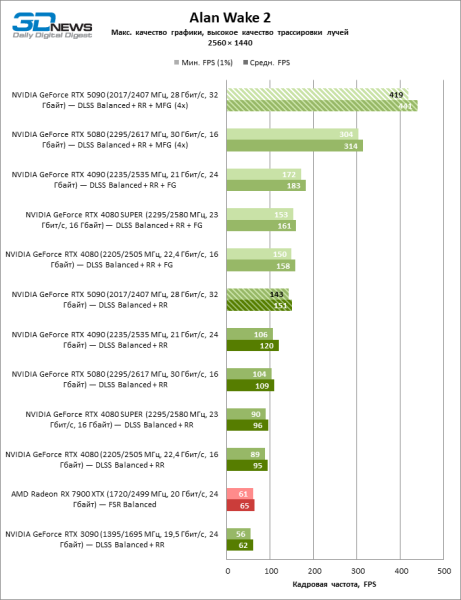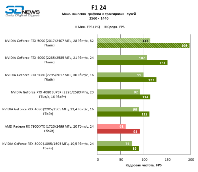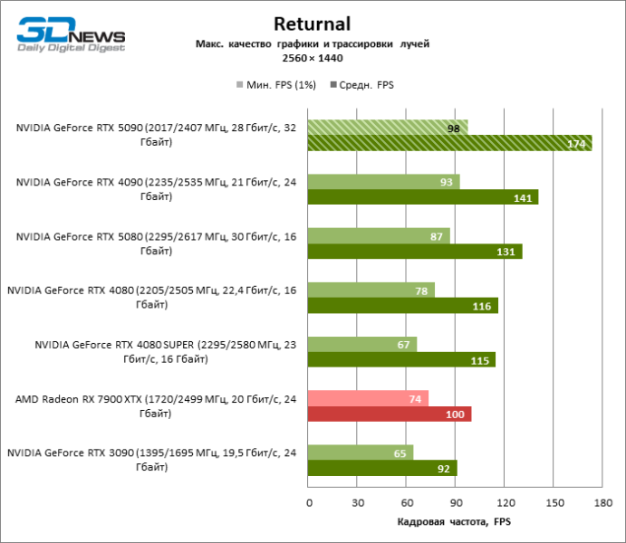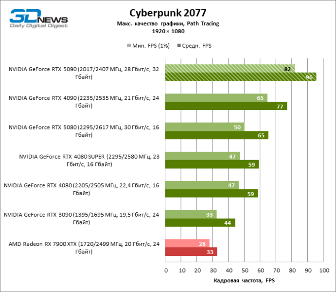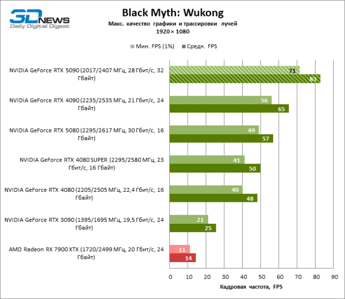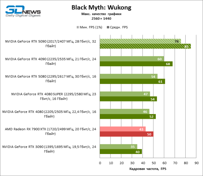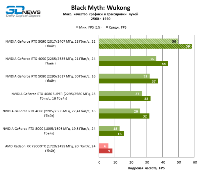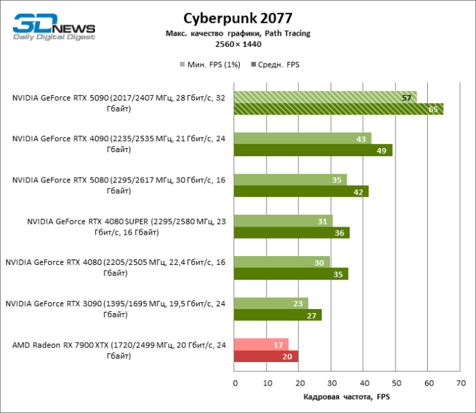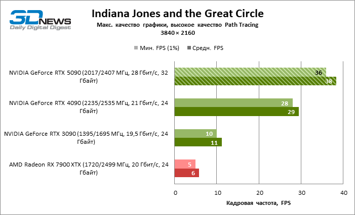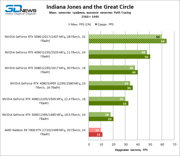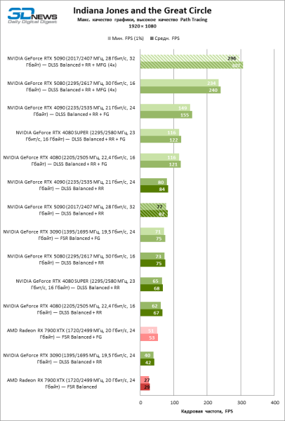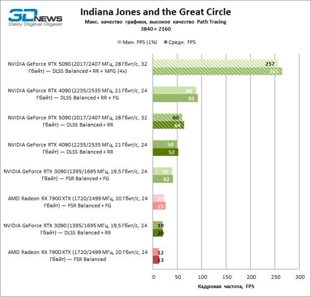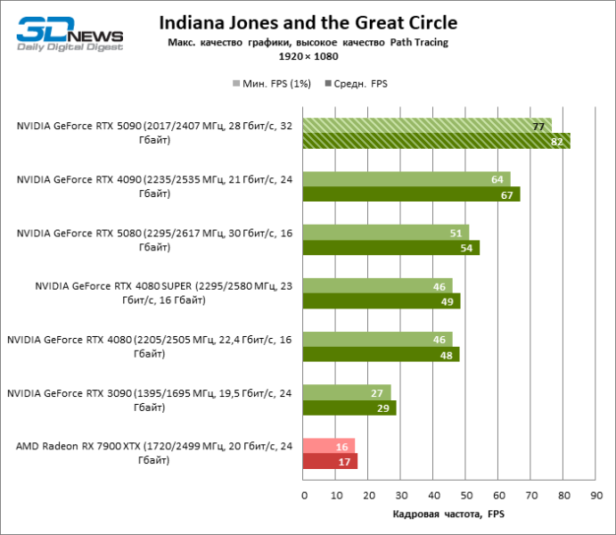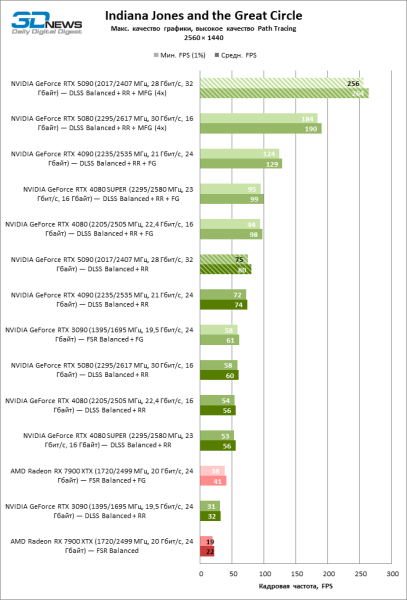 В тайтлах с гибридным рендерингом, причем в нативном разрешении экрана, кадровая частота на GeForce RTX 5090 составляет не меньше 96 FPS, а все полностью трассированные игровые бенчмарки продемонстрировали как минимум 59 FPS в режиме 1440p. При этом 32 Гбайт видеопамяти позволяют GeForce RTX 5090 комбинировать разрешение 4К с максимальными настройками графики в Indiana Jones and the Great Circle, что недоступно ускорителям с 16 Гбайт VRAM.