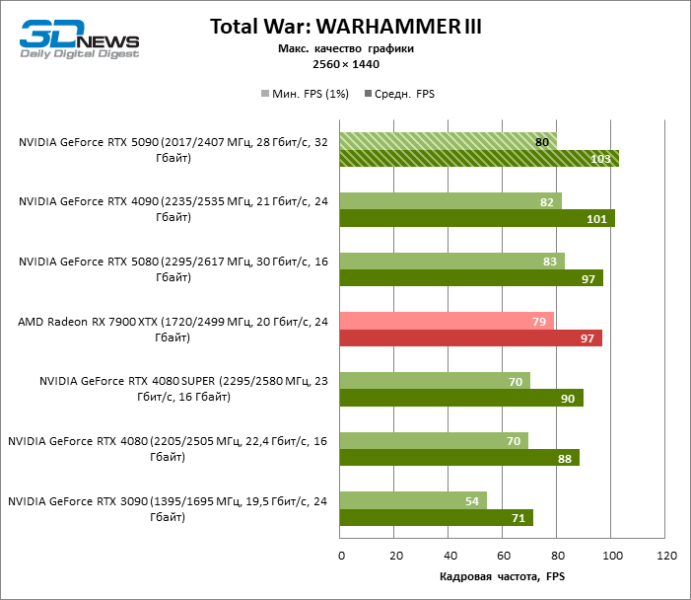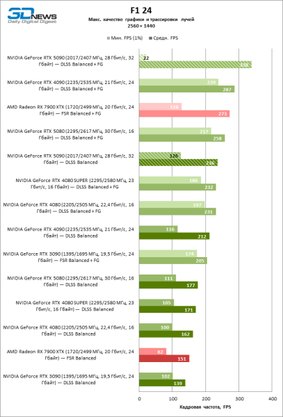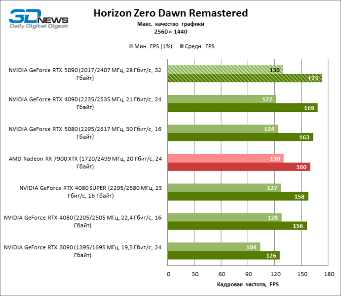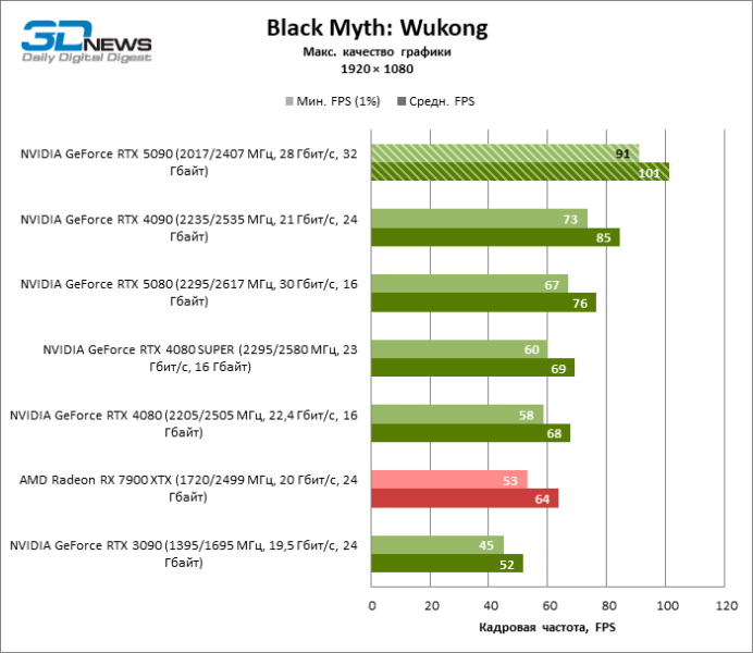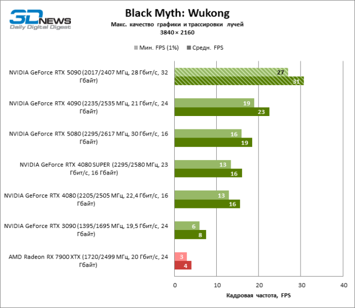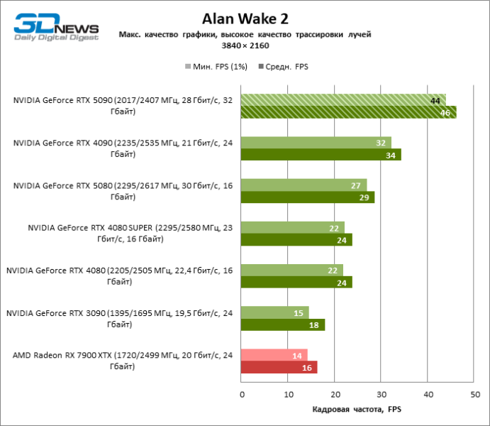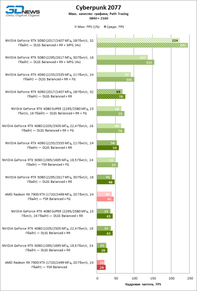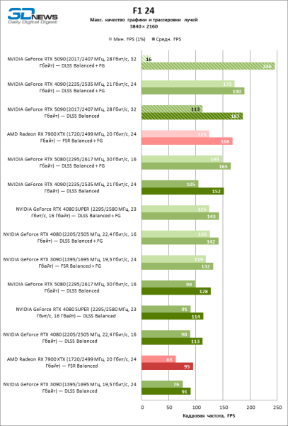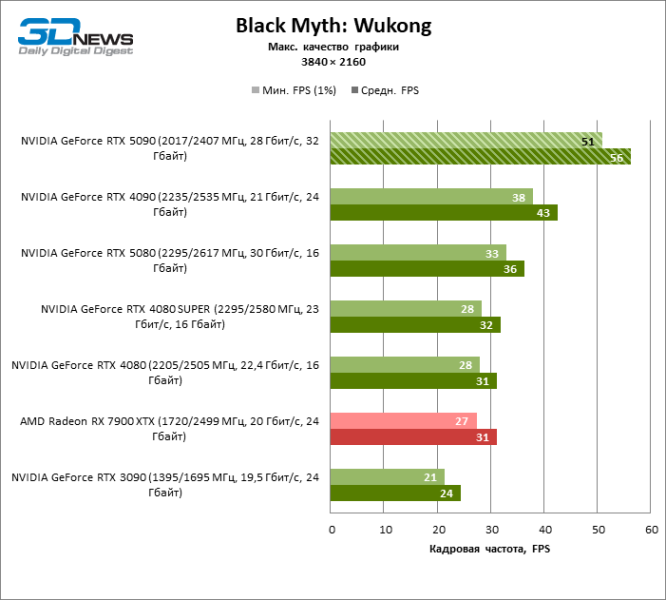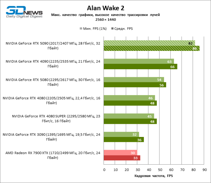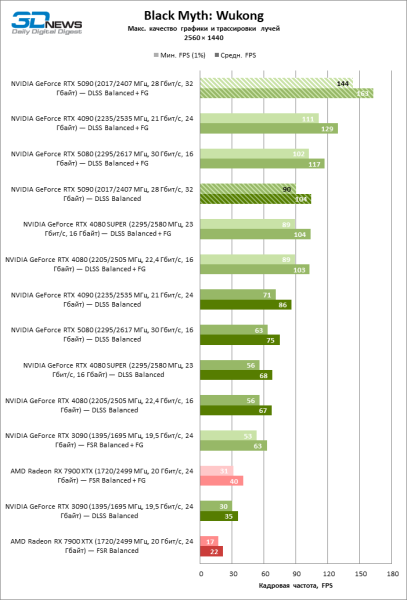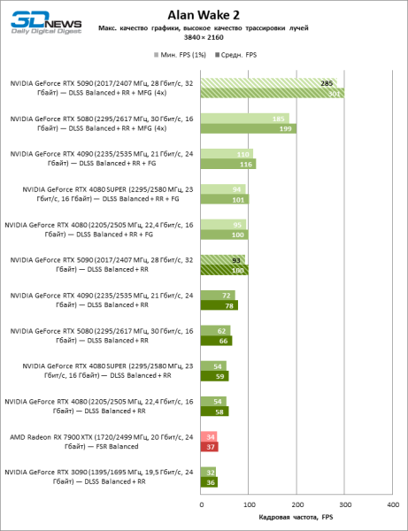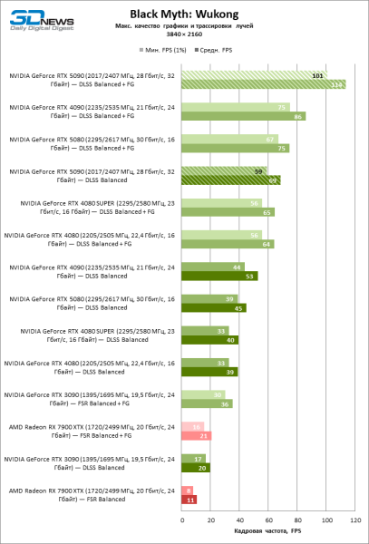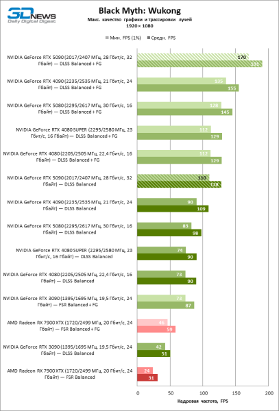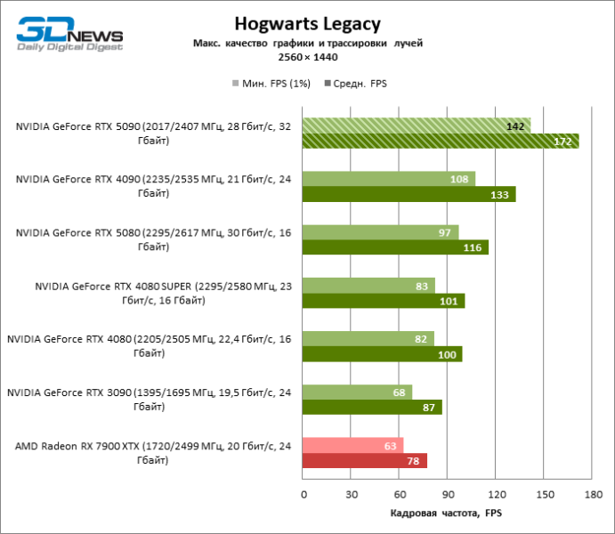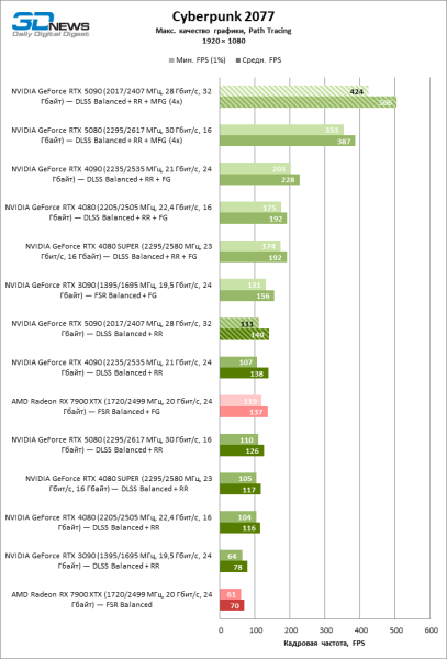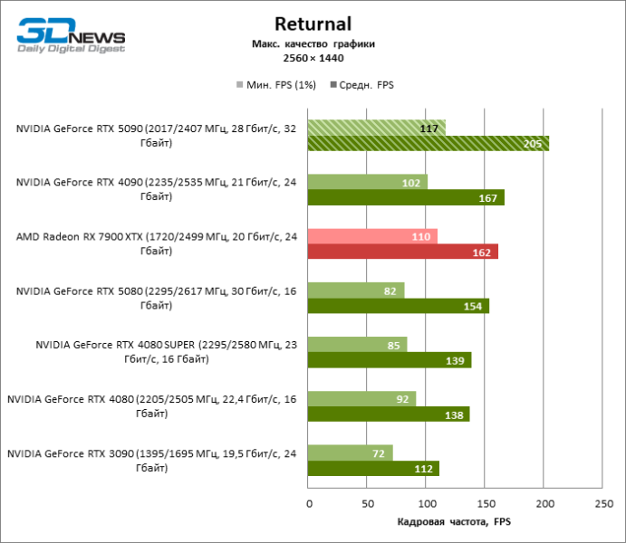 В тайтлах с гибридным рендерингом, причем в нативном разрешении экрана, кадровая частота на GeForce RTX 5090 составляет не меньше 96 FPS, а все полностью трассированные игровые бенчмарки продемонстрировали как минимум 59 FPS в режиме 1440p. При этом 32 Гбайт видеопамяти позволяют GeForce RTX 5090 комбинировать разрешение 4К с максимальными настройками графики в Indiana Jones and the Great Circle, что недоступно ускорителям с 16 Гбайт VRAM.