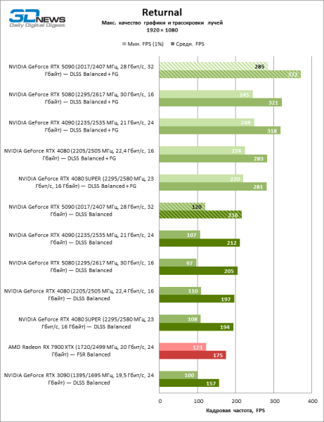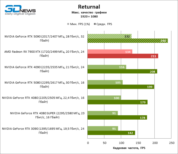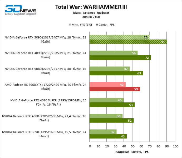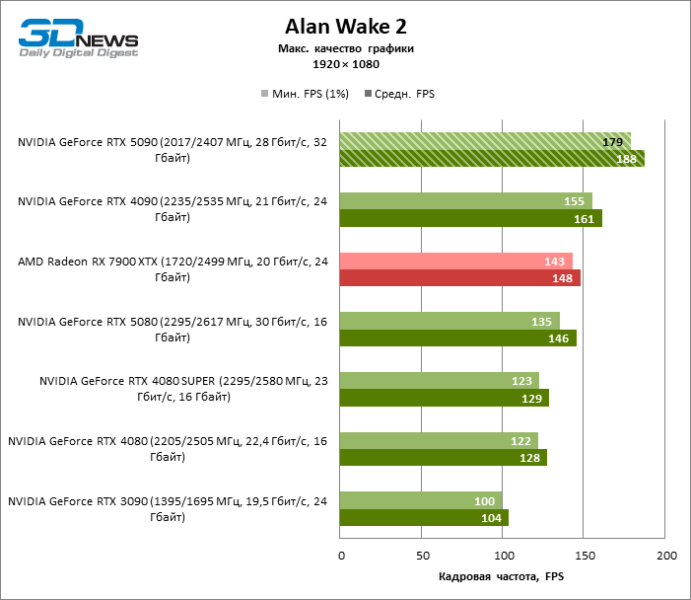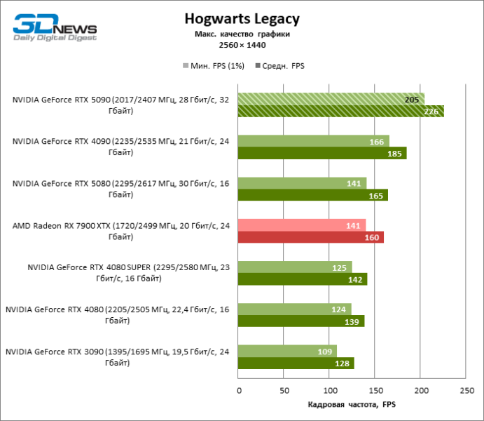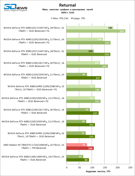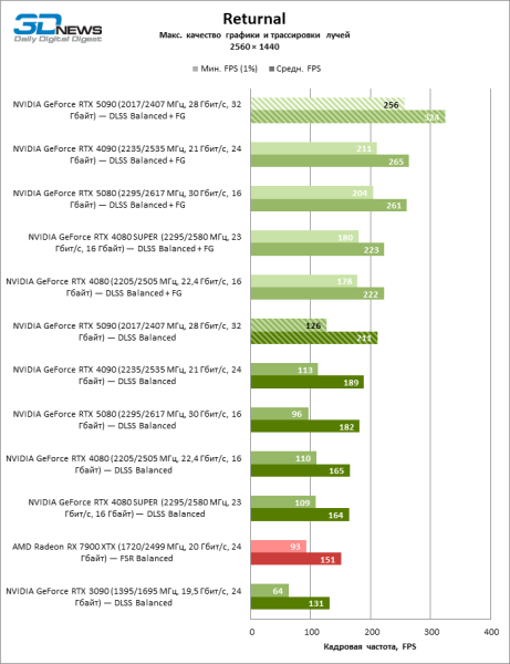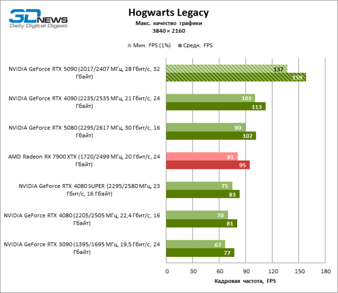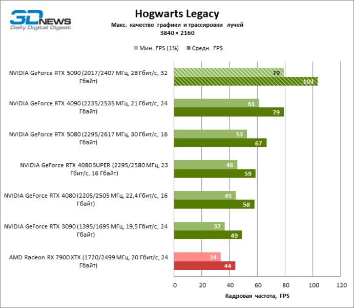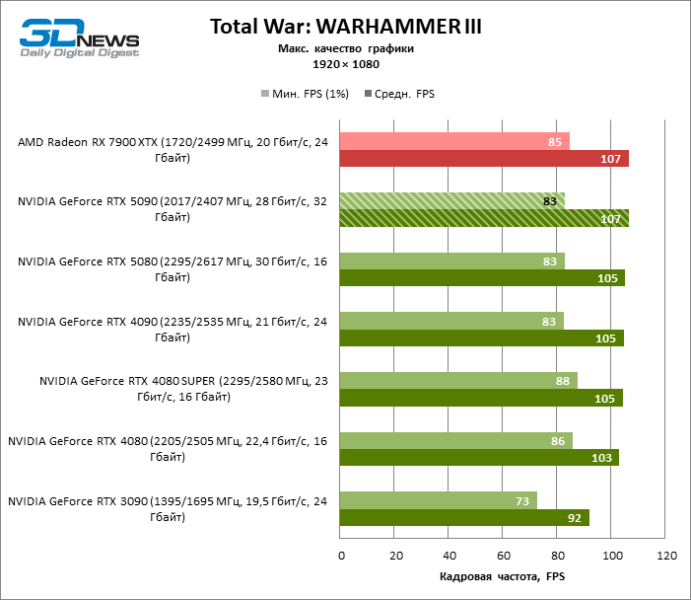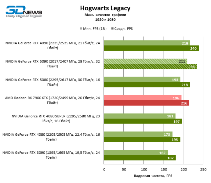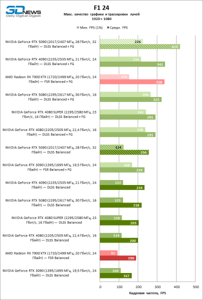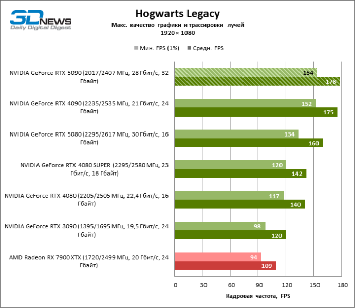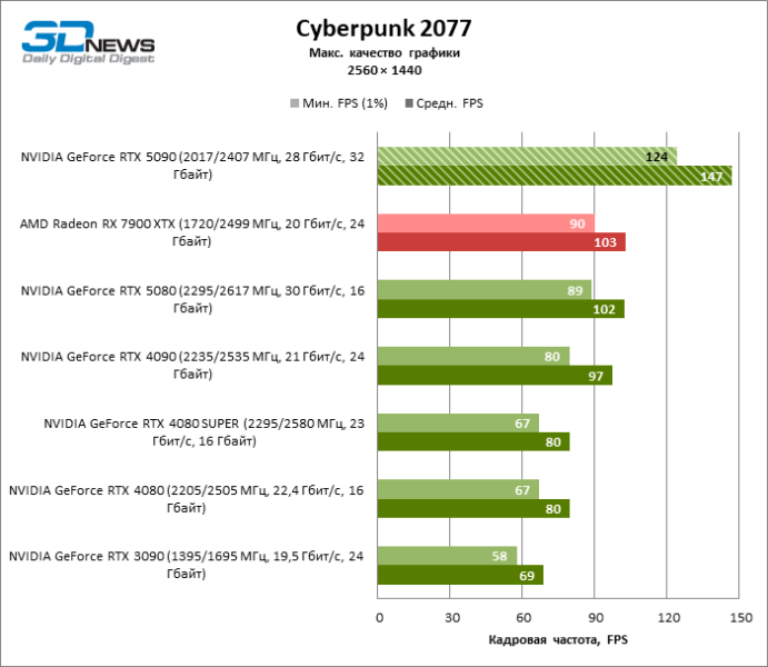 В тайтлах с гибридным рендерингом, причем в нативном разрешении экрана, кадровая частота на GeForce RTX 5090 составляет не меньше 96 FPS, а все полностью трассированные игровые бенчмарки продемонстрировали как минимум 59 FPS в режиме 1440p. При этом 32 Гбайт видеопамяти позволяют GeForce RTX 5090 комбинировать разрешение 4К с максимальными настройками графики в Indiana Jones and the Great Circle, что недоступно ускорителям с 16 Гбайт VRAM.