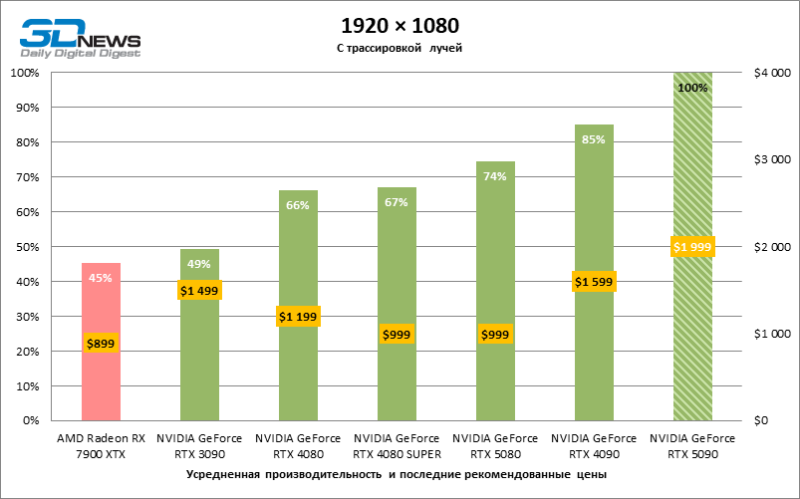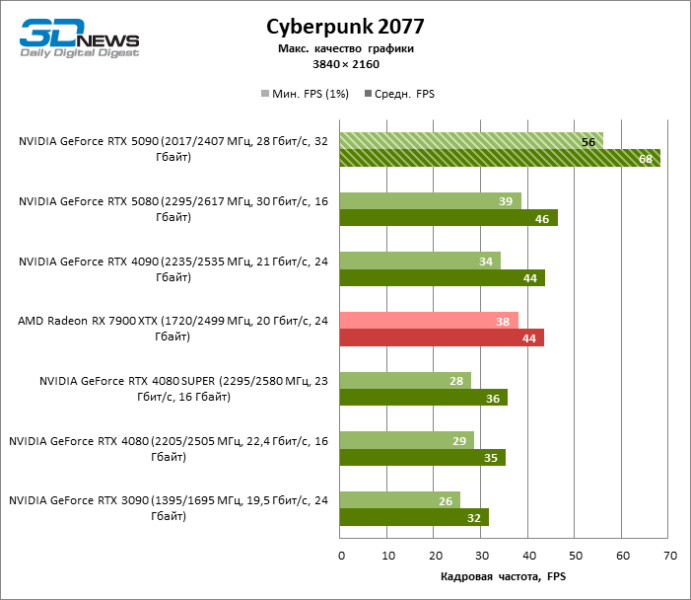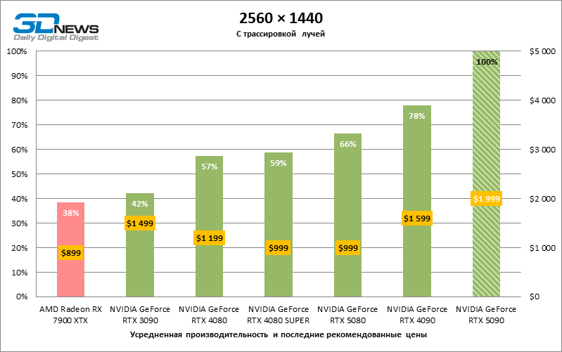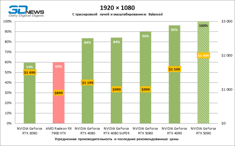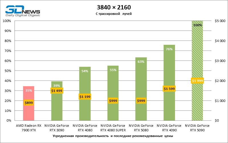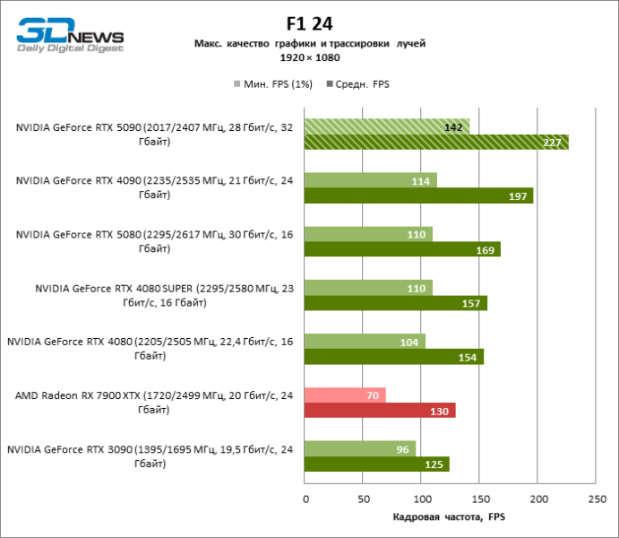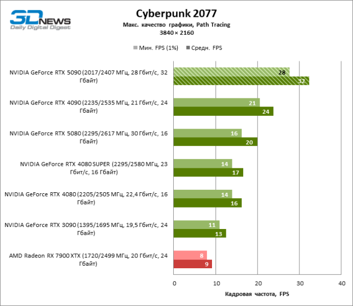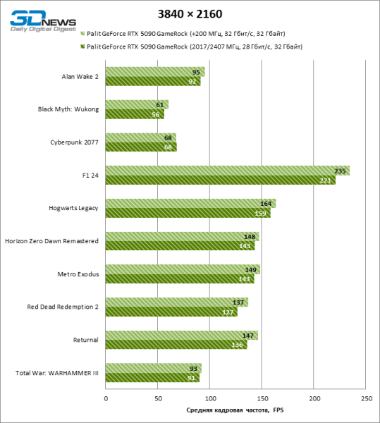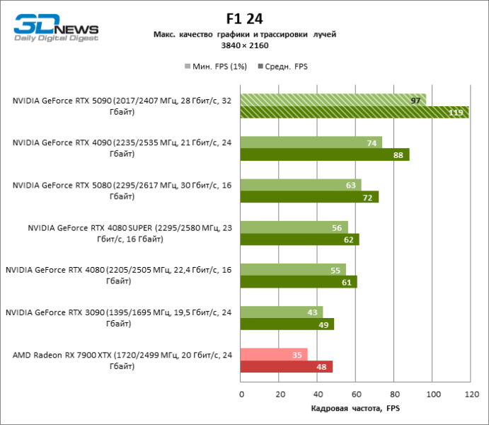 Разница в производительности между соперничающими устройствами варьирует в зависимости от разрешения экрана. Если взять за точку отсчета GeForce RTX 4090, GPU нового поколения обеспечил рост фреймрейта на 18–32 %. По сравнению с GeForce RTX 5080 средняя кадровая частота стала выше на 34–58 %, а по сравнению с GeForce RTX 4080 или RTX 4080 SUPER — на 49–86 %. GeForce RTX 3090 пропустил новинку вперед на 103–155 % FPS. Наконец, GeForce RTX 5090 оказался в два-три раза быстрее Radeon RX 7900 XT — и это не удивительно, если учесть, что половина тестовых игр в режиме RT уже использует бескомпромиссную трассировку путей вместо гибридного рендеринга.