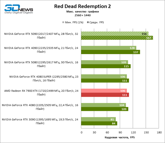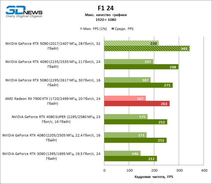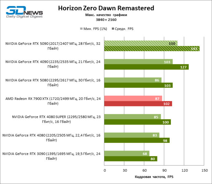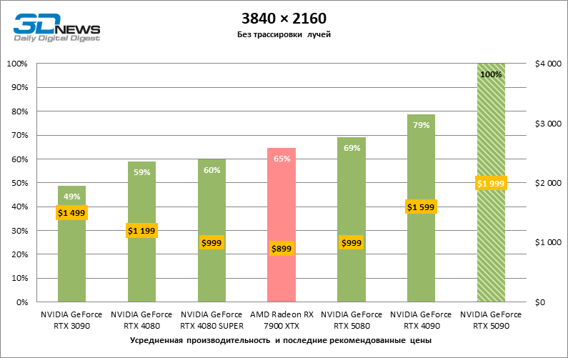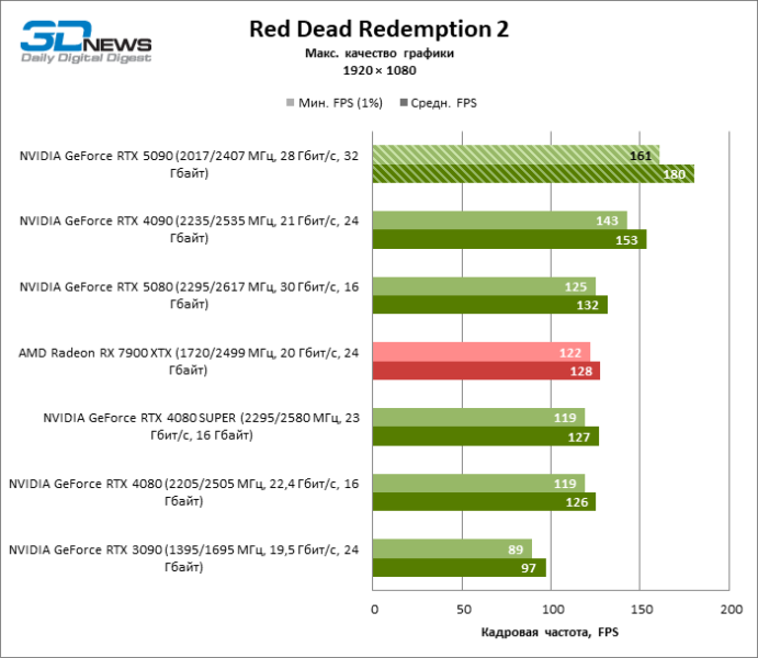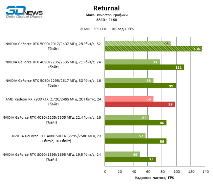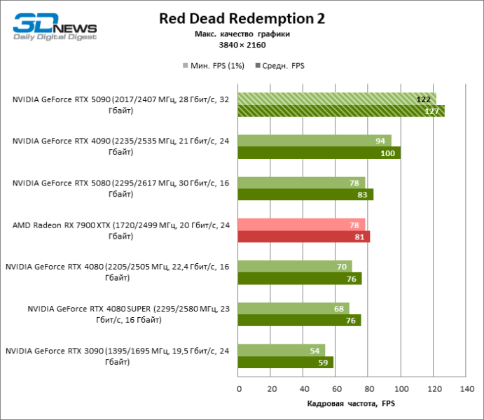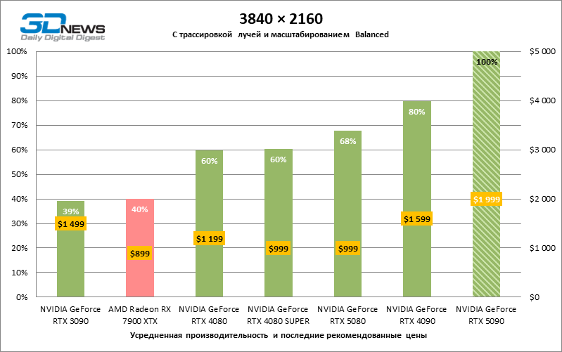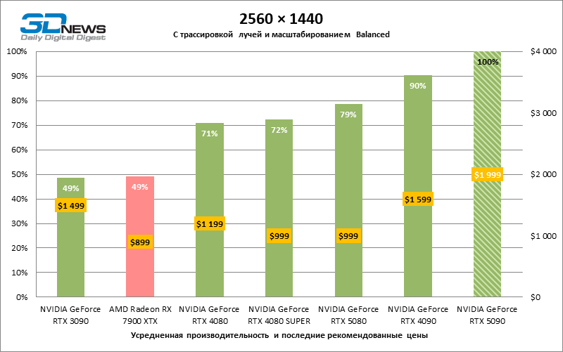 Разница в производительности между соперничающими устройствами варьирует в зависимости от разрешения экрана. Если взять за точку отсчета GeForce RTX 4090, GPU нового поколения обеспечил рост фреймрейта на 18–32 %. По сравнению с GeForce RTX 5080 средняя кадровая частота стала выше на 34–58 %, а по сравнению с GeForce RTX 4080 или RTX 4080 SUPER — на 49–86 %. GeForce RTX 3090 пропустил новинку вперед на 103–155 % FPS. Наконец, GeForce RTX 5090 оказался в два-три раза быстрее Radeon RX 7900 XT — и это не удивительно, если учесть, что половина тестовых игр в режиме RT уже использует бескомпромиссную трассировку путей вместо гибридного рендеринга.