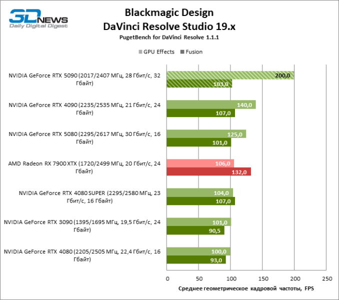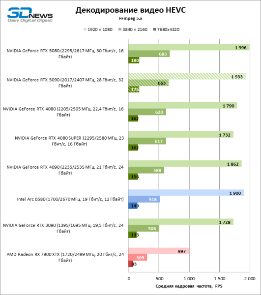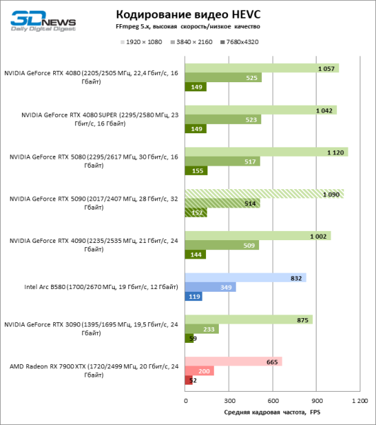 Тесты транскодирования в DaVinci Resolve подтвердили прибавку скорости в аппаратном декодере H.264 и HEVC по сравнению с «зелеными» ускорителями прошлого поколения, но, если отталкиваться от результатов GeForce RTX 5080 и Radeon RX 7900 XTX, усредненное преимущество GeForce RTX 5090 невелико.