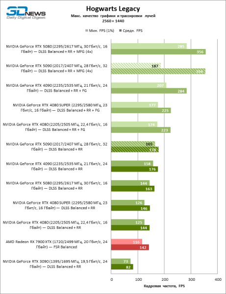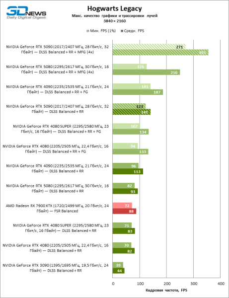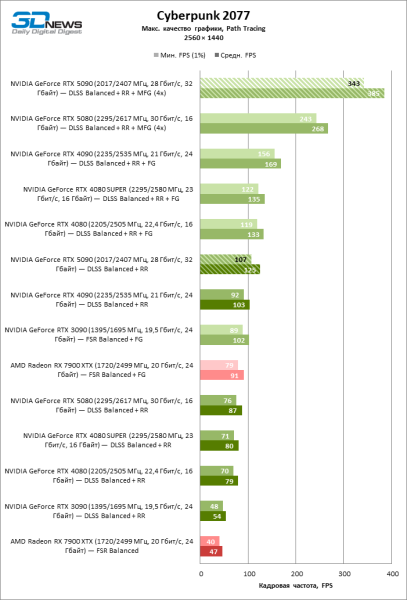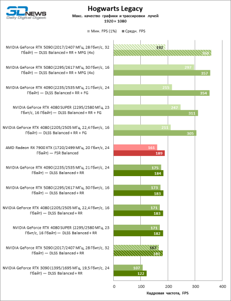 В играх, которые поддерживают DLSS 4 с возможностью генерации трех кадров на каждый «честный» кадр, фреймрейт измеряется сотнями FPS, однако результаты такого же порядка доступны и RTX 5080.