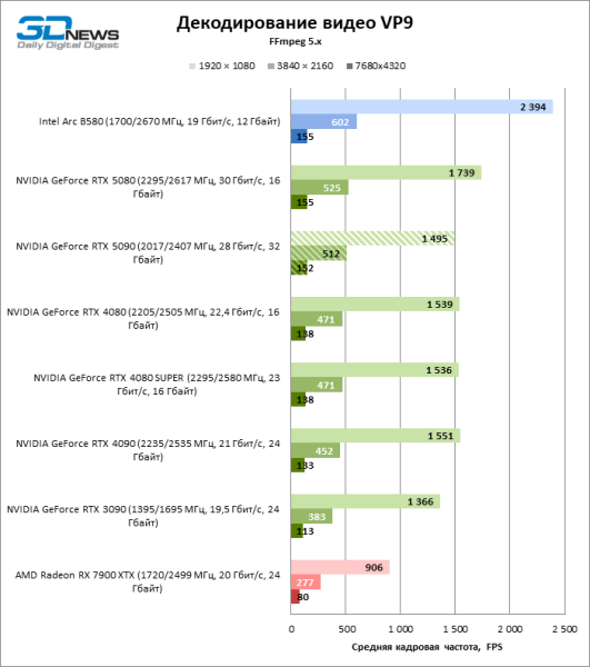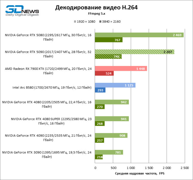 Как показывают тесты, GeForce RTX 5080 и RTX 5090 эквивалентны по быстродействию аппаратного медиакодека. Главным нововведением архитектуры Blackwell в этой области является увеличенная более чем вдвое скорость декодирования H.264. Другие форматы (HEVC, VP9 и AV1) получили умеренную прибавку к пропускной способности. В результате чипы NVIDIA доминируют во всех бенчмарках декодирования за исключением отдельных случаев, когда на первом месте стоит интеловская видеокарта Arc B580.