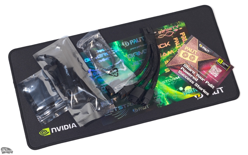 В коробке с видеокартой мы нашли переходник с четырех восьмиконтактных штекеров старого образца на стандарт 12V-2×6, кабель синхронизации ARGB, сборную подпорку для монтажа видеокарты и тканевый коврик для мыши.