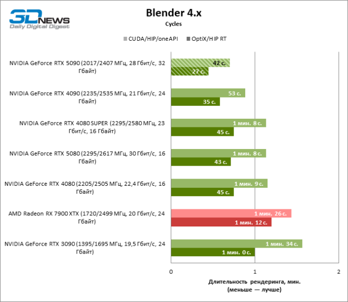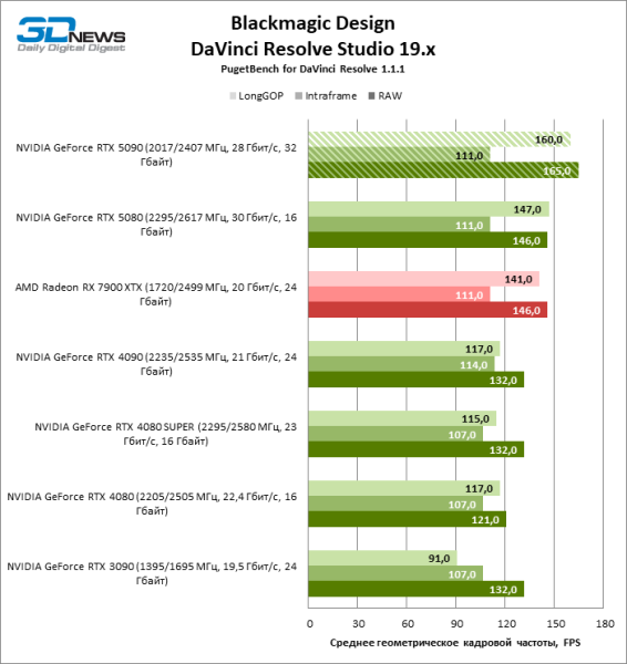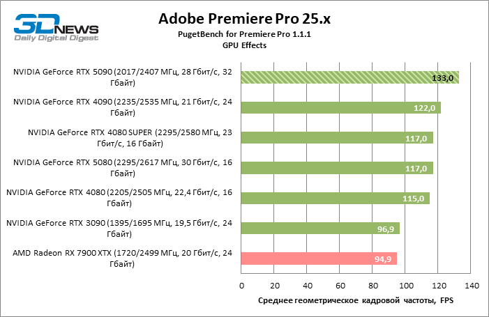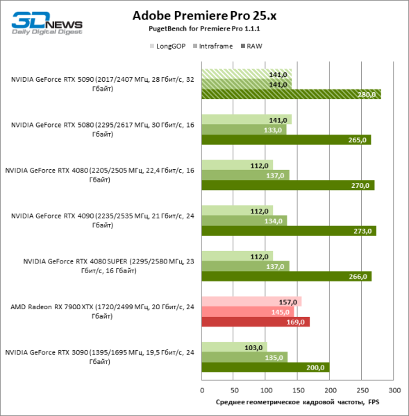 В тестах транскодирования видео с помощью Premiere Pro новый флагман ненамного превосходит GeForce RTX 5080, но скорость работы с H.264 и HEVC заметно выросла по сравнению с GeForce RTX 4090 и достигла уровня Radeon RX 7900 XTX. При этом надо заметить, что «зеленые» видеокарты двух последних поколений намного лучше справляются с RAW-форматами, чем продукты AMD.
