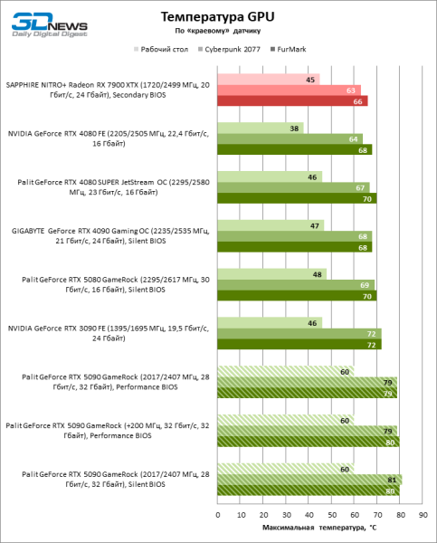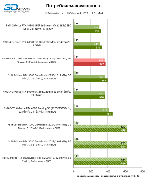| Средняя потребляемая мощность (FurMark), Вт | 626 | 370 | 332 | 317 | 454 | 397 | 372 |