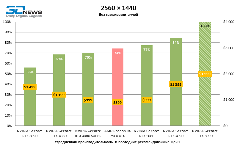 Наконец, NVIDIA выпустила GeForce RTX 5090 по рекомендованной стоимости $1 999 — на 25 % выше MSRP бывшего флагмана, RTX 4090. Выходит, что курс обмена валюты на прибавку быстродействия у NVIDIA примерно такой же, как курс доллара в СССР: один к одному. Или, если угодно, в стоимости новинки просто зафиксировали настоящие суммы, за которые на протяжении большей части своего жизненного цикла продавался RTX 4090, а ведь RTX 5090 на третий месяц после начала продаж страдает от такого же дефицита.