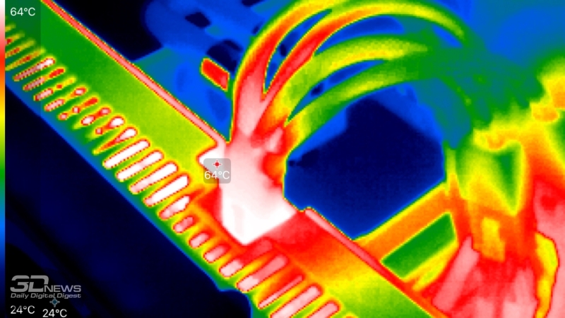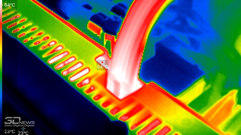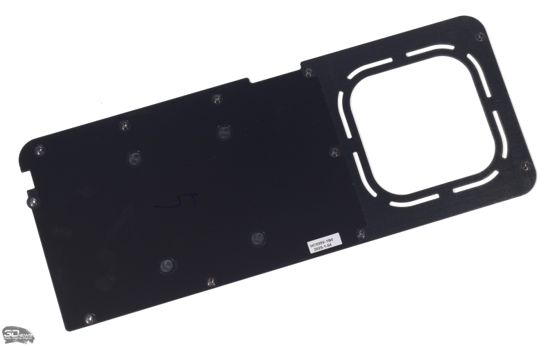 Боковые грани кожуха СО сформированы монолитной алюминиевой рамой с поперечными вентиляционными прорезями. Металлическая пластина на обратной стороне печатной платы имеет крупное окно в зоне проекции одного из вентиляторов. Сами вентиляторы с диаметром крыльчатки 94 мм начинают вращаться только при высокой нагрузке на GPU. В условном бездействии ускоритель охлаждается пассивно.