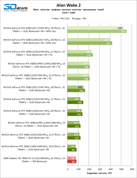 Сравнивая результаты бенчмарков GeForce RTX 5090 с нативным разрешением и DLSS, можно заметить, что далеко не в каждой игре фреймрейт реагирует на масштабирование кадров. В половине тестов в режиме 1080p и 1440p прибавка быстродействия либо практически несущественна, либо и вовсе стремится к нулю. Как бы то ни было, благодаря апскейлингу с параметром качества Balanced новинке покорился комфортный фреймрейт не меньше 60 FPS на 4К-экране в полностью трассированных тайтлах.