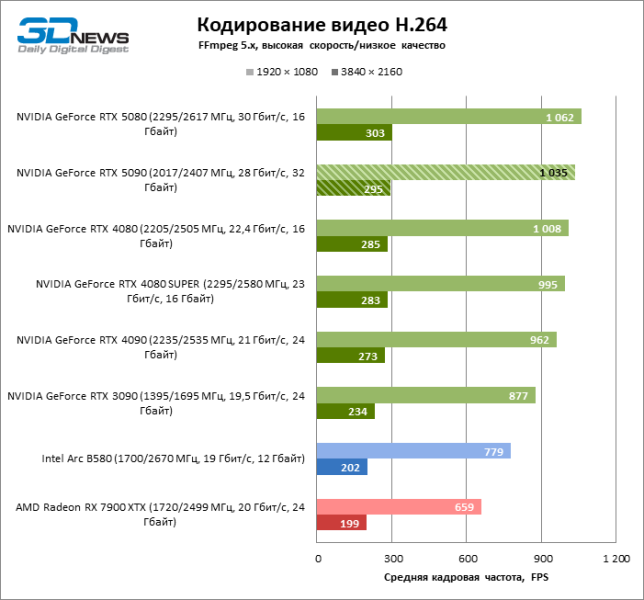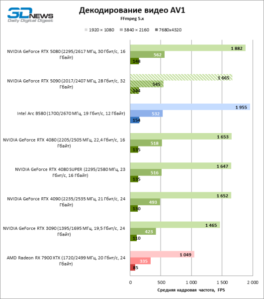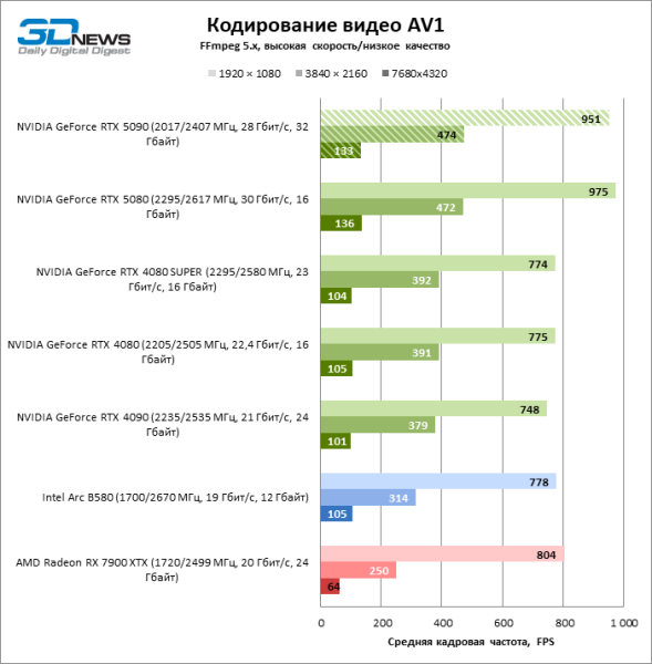 В задаче кодирования видео силами аппаратного блока NVENC ощутимо возросла скорость работы с форматом AV1, что возвращает «зеленым» GPU безоговорочное лидерство.