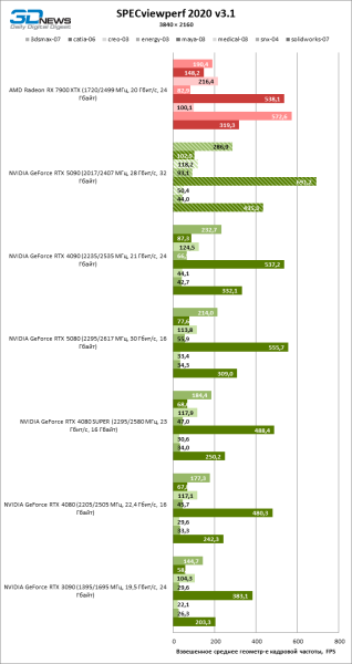 Наконец, GeForce RTX 5090 уверенно превосходит RTX 4090 и в полтора раза опережает RTX 5080 по результатам SPECviewperf. Однако в ряде CAD-приложений Radeon RX 7900 XTX по-прежнему обладает недосягаемым быстродействием благодаря оптимизациям драйвера.