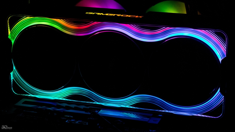 Фронтальная панель кожуха системы охлаждения имеет зеркальную поверхность и ступенчатый рельеф, в котором отражается свет LED-ленты, окружающей вентиляторы. Работой подсветки можно управлять в отдельности или синхронизировать ее с материнской платой через ARGB-разъем, который расположен рядом с вводом питания 12V-2×6.